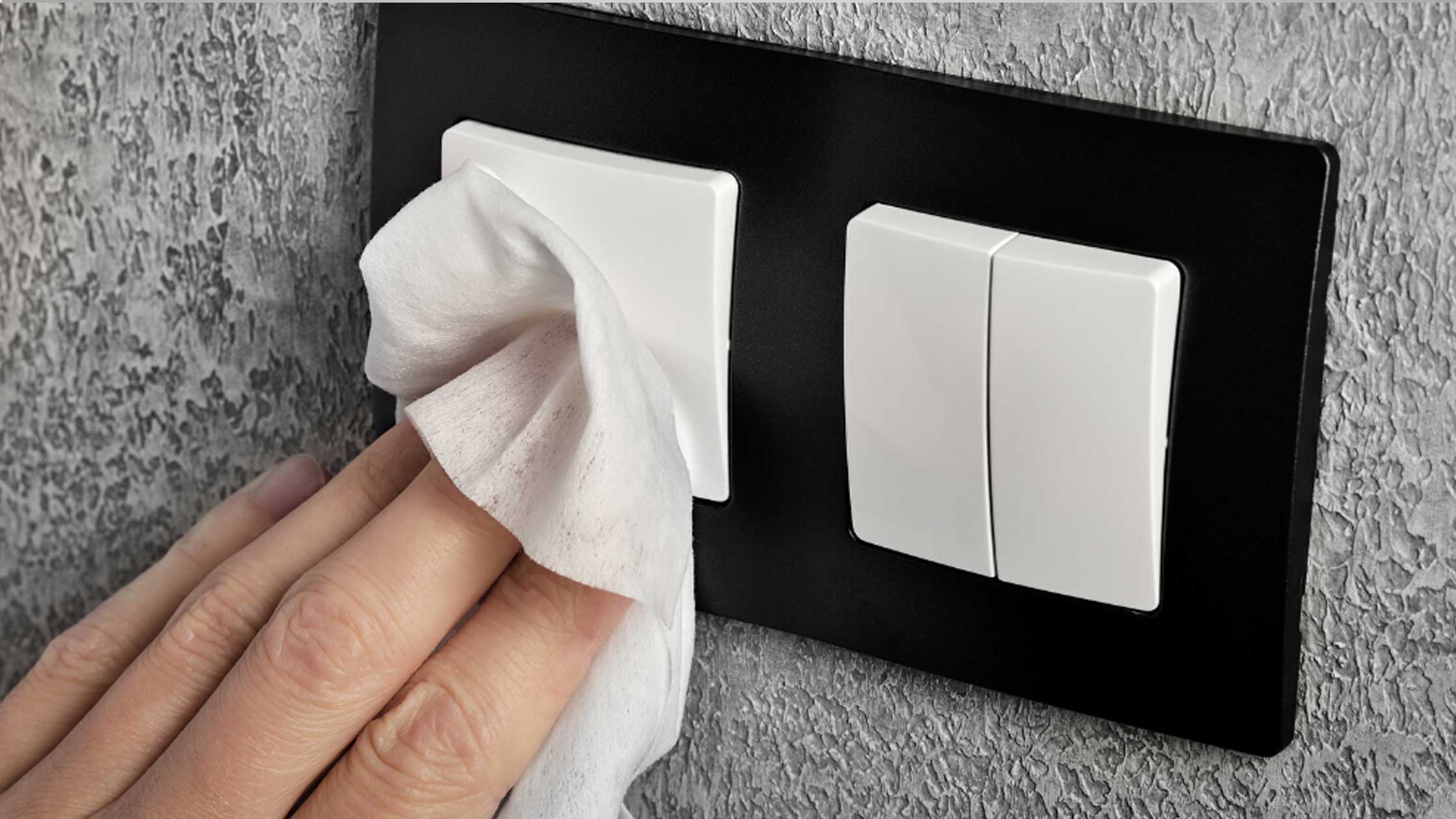 After the surface has been washed and has dried, now you disinfect it. Using a disposable wipe is the most effective, as opposed to a spray.